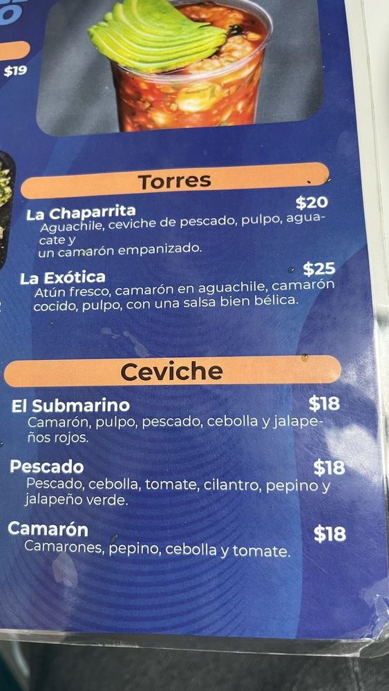 Fresh shrimp, octopus, onions,tomato,cilantro, jalapeos, Cucumber, avocado in homemade sauce